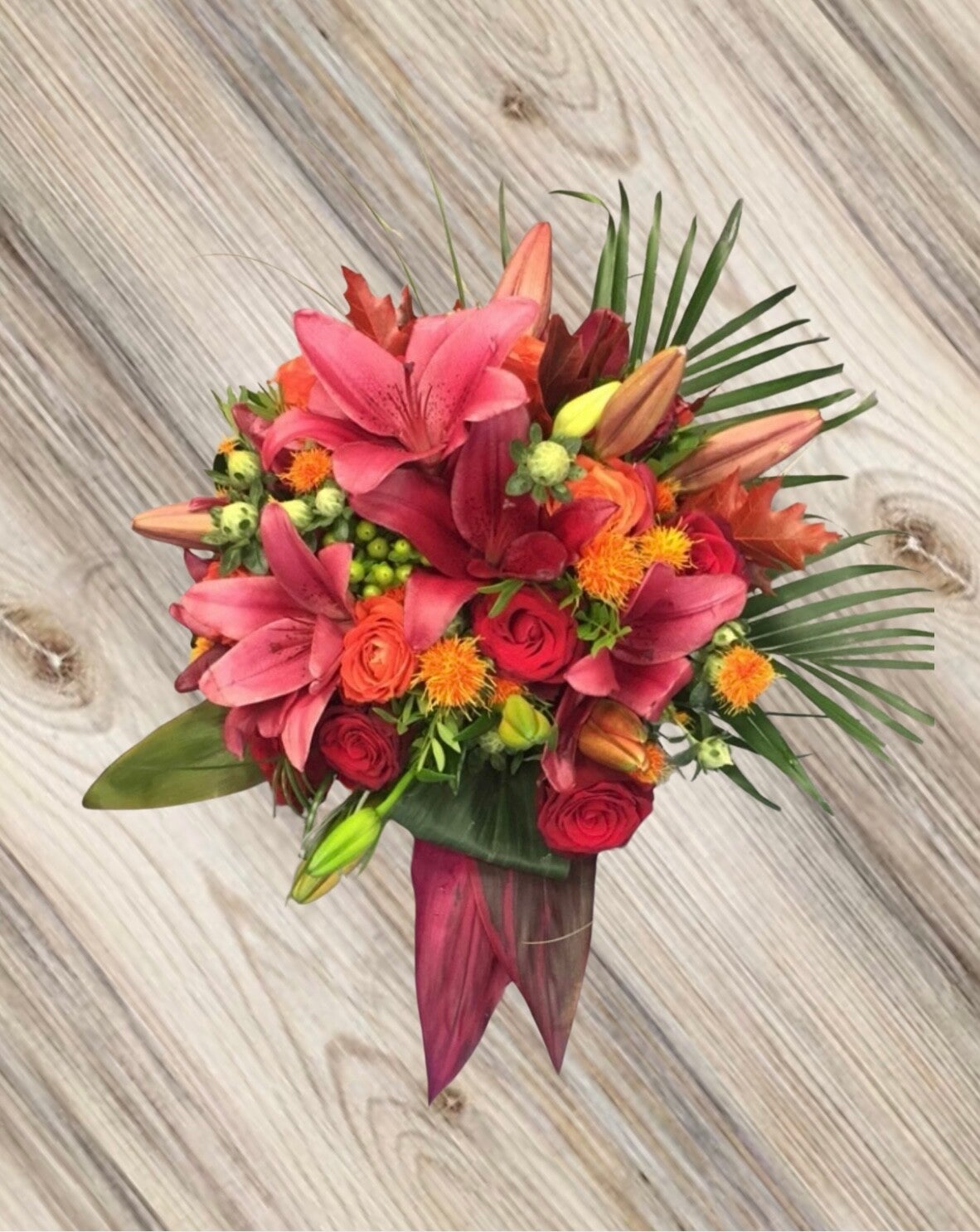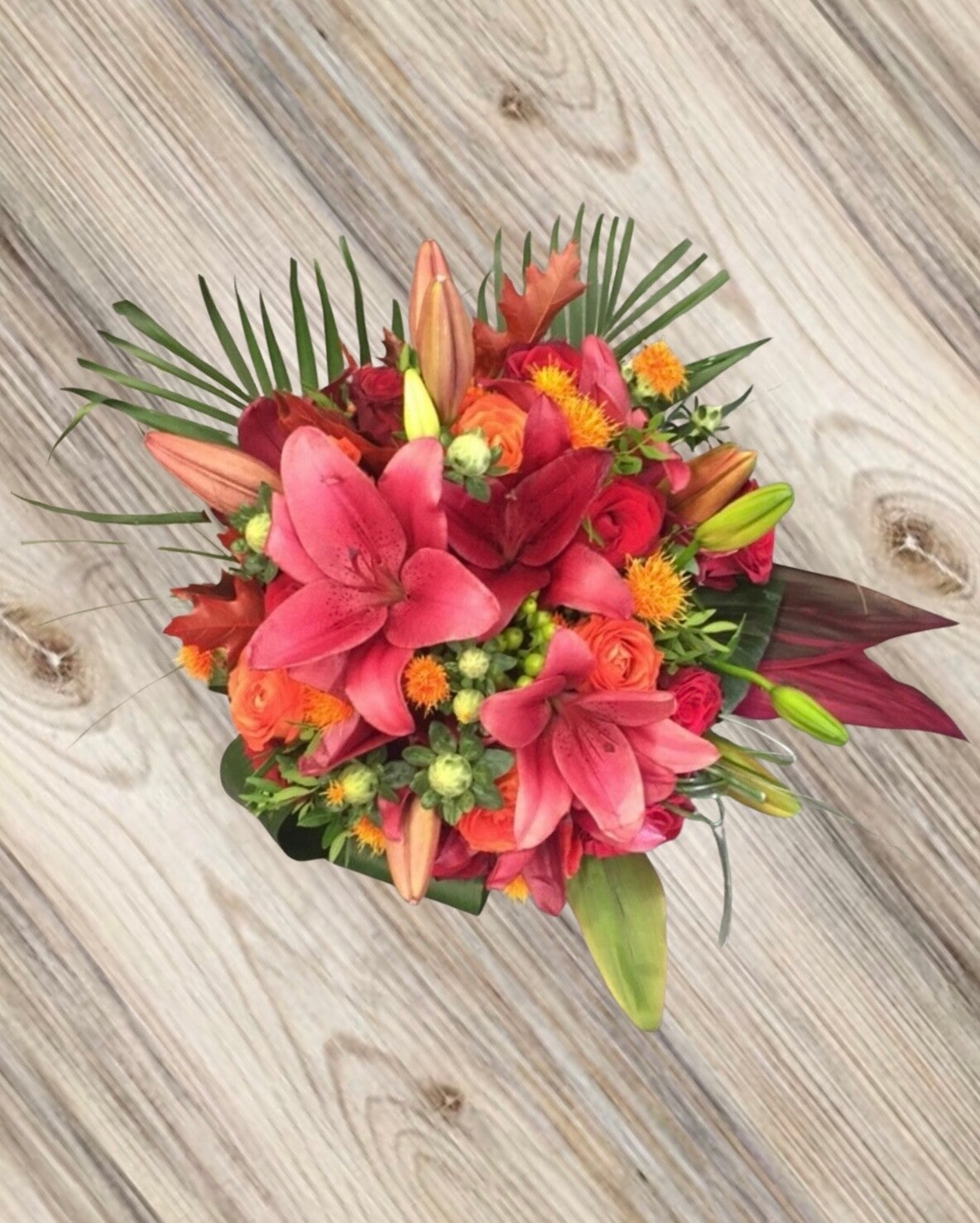 Dans les tons chaud, fait avec : Lys - Roses - Hypericum - Carthamus (Ressemble au Chardon) - Feuillages