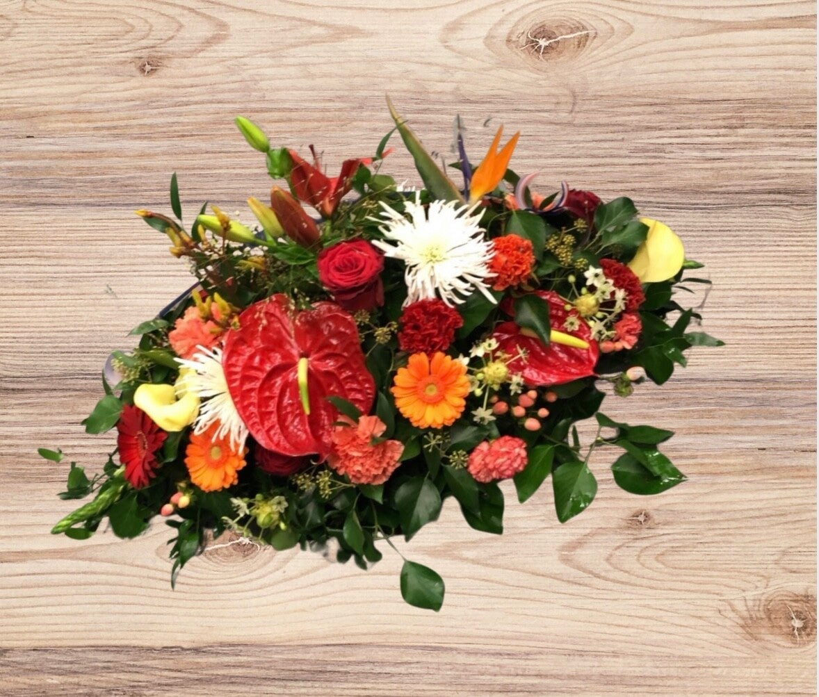 • Strelitzia (Oiseau du paradis) - Anthurium - Roses - Germini - Œillet - Lys - Calla - Hypericum - Crocosmia - Lierre boule