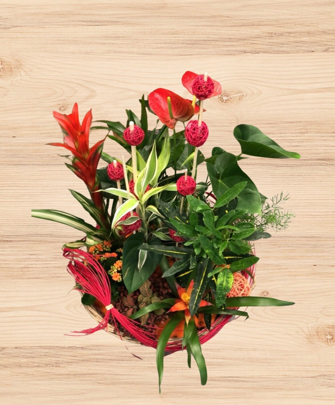 Composition de plantes grasses et tropicales (plantes d'intérieur) dans ces tons chaud : Rouge, Orange, Vert