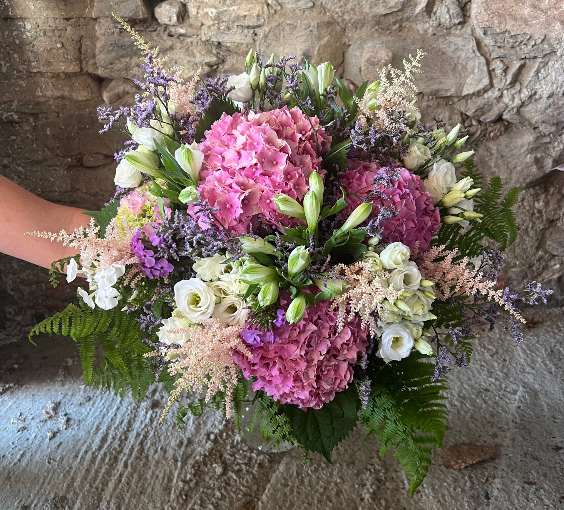 Bouquet généreux et aérien, composé d’hortensias roses et verts, lisianthus blancs, alstroemeria, astilbe, limonium et fougères. Cette création florale, aux longues tiges et au style naturel, mêle élégance et légèreté.