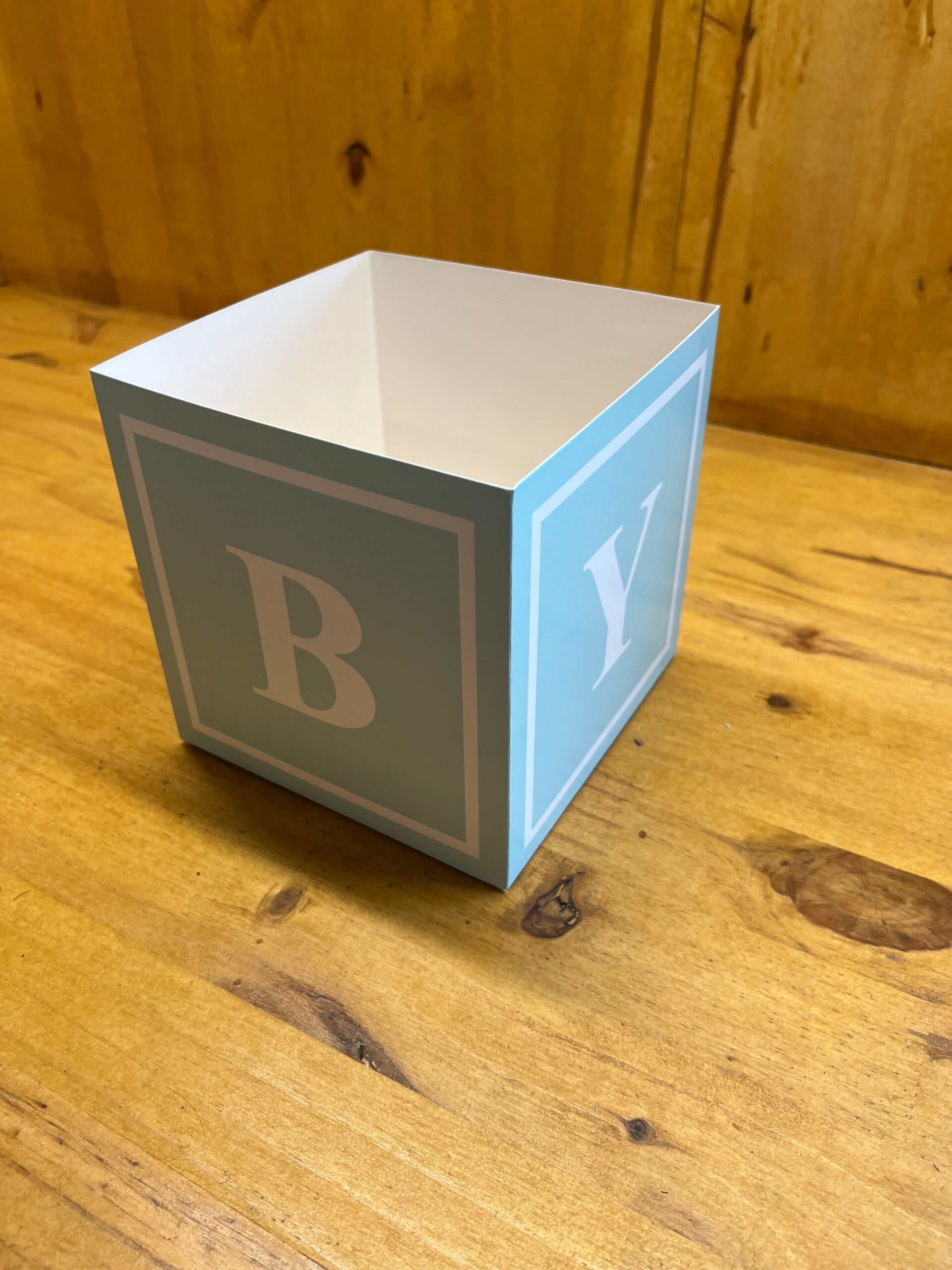Nos boîtes “Baby”, en carton rigide au format cubique, sont déclinées en rose, bleu ou vert pastel, avec un design inspiré des cubes de jouet d’enfant.