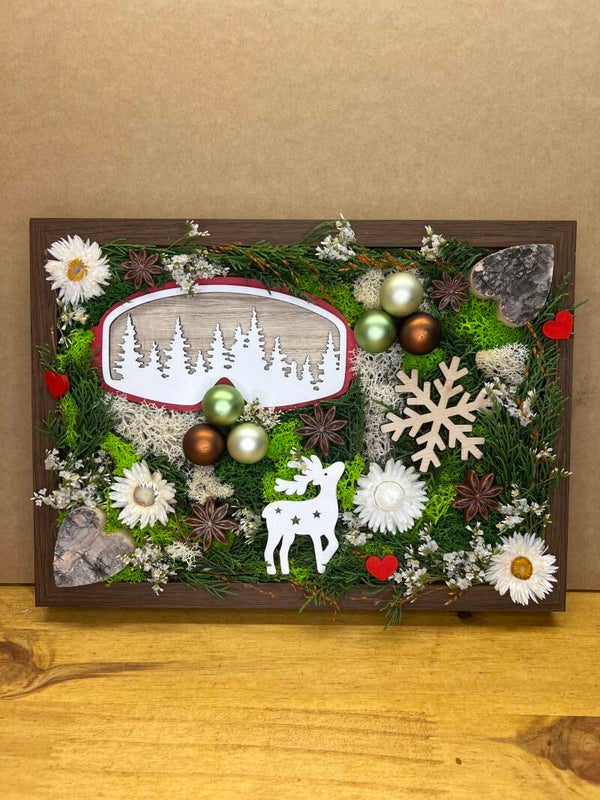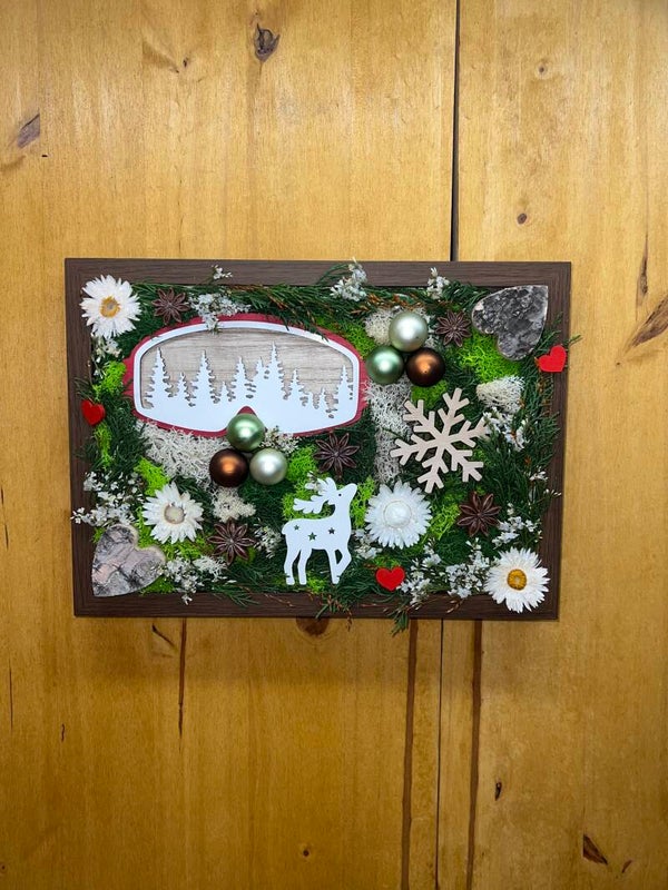 Un tableau hivernal enchanteur mêlant mousse stabilisée, bois et décorations naturelles. Entre sapins, flocons et petit renne, cette création évoque la magie des forêts enneigées et apporte une ambiance cosy et festive à votre intérieur.