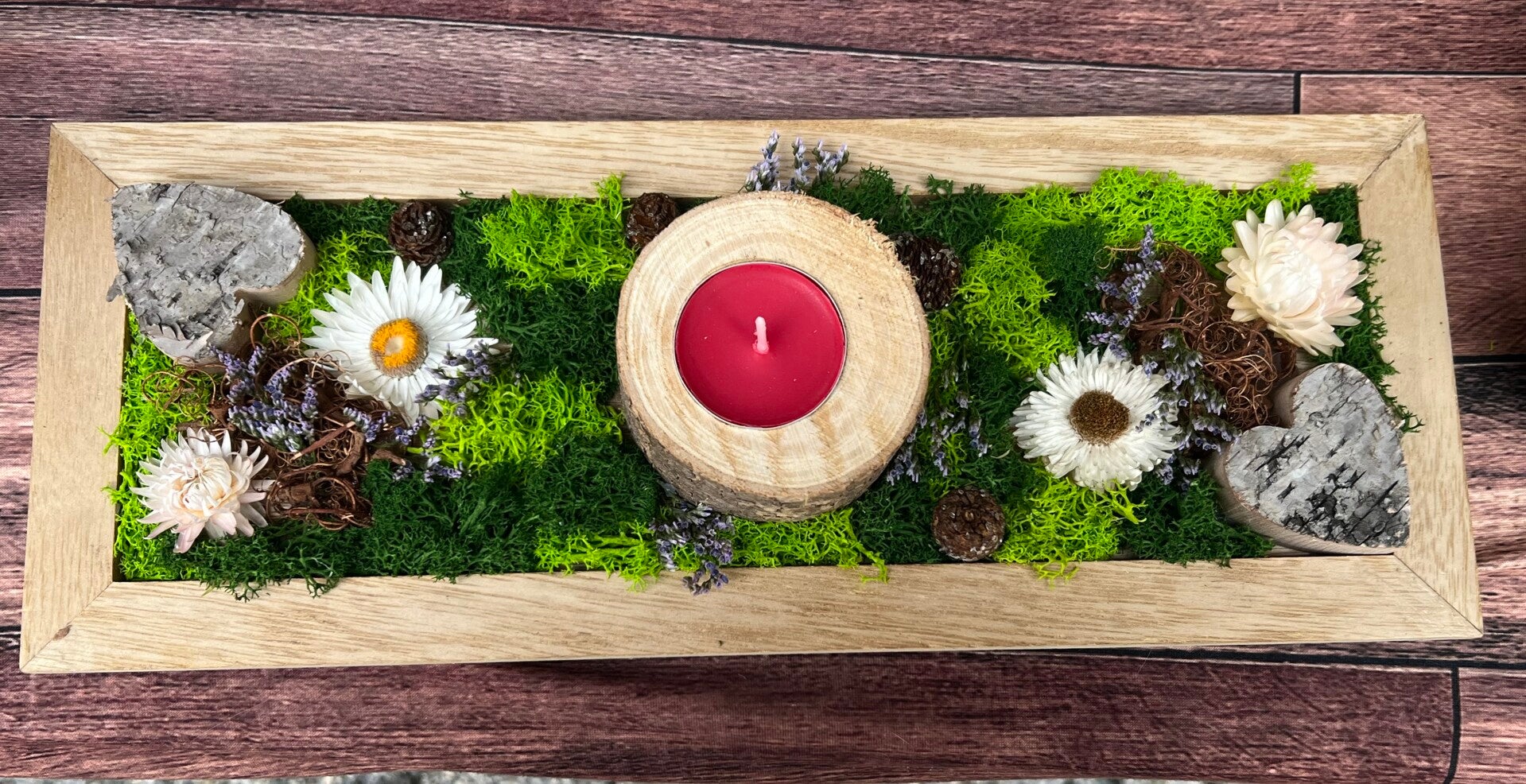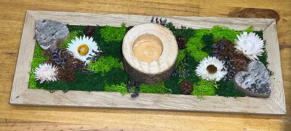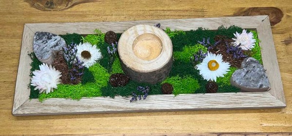 Un plateau décoratif tout en douceur, composé de lichen, fleurs séchées et un photophore central en bois. Une pièce élégante qui diffuse une atmosphère apaisante, parfaite pour illuminer vos soirées.